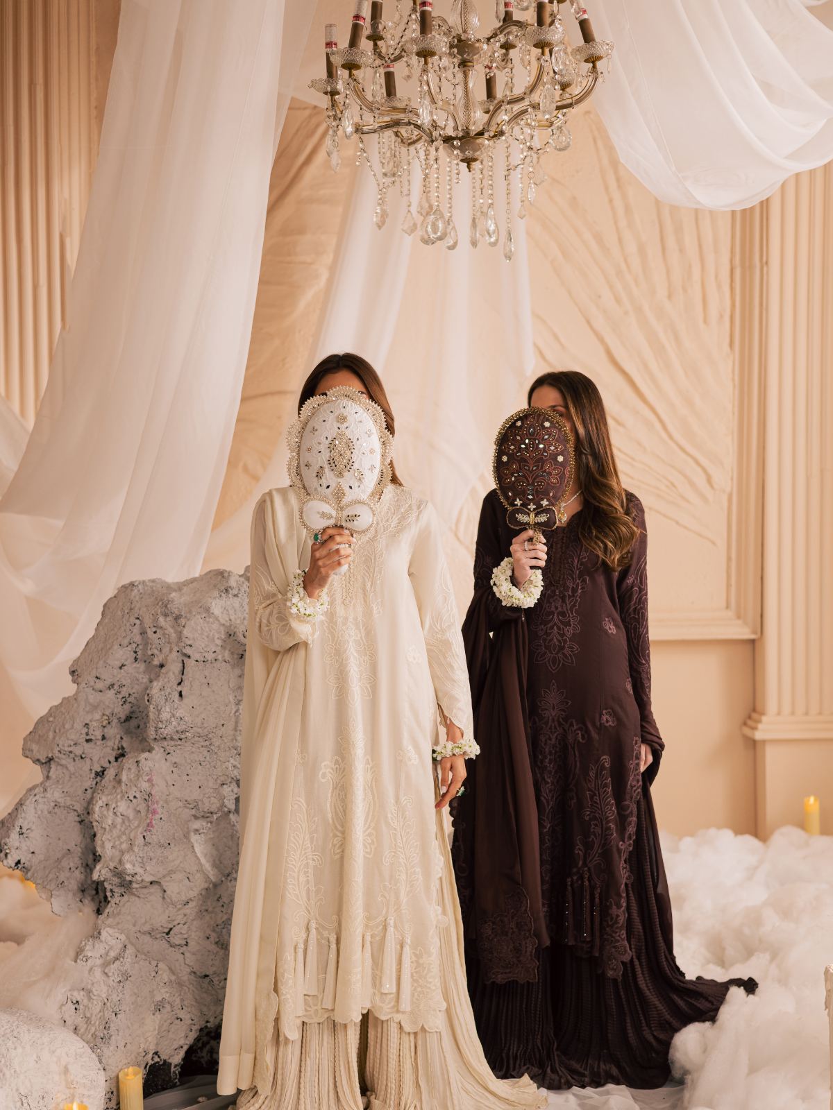 Gul Bahaar is a vision of soft elegance in timeless beige tones. The full-length silk dress features a delicate floral print, layered with a flowing khadi net gown adorned with intricate embroidery, subtle panni work, and lace detailing. Finished with embellished white tassels and paired with cotton silk straight pants, the look is completed with a khadi net dupatta trimmed in lace for added grace.